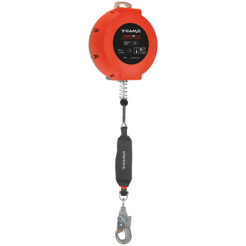 Cavo in acciaio zincato, carico di rottura 12 kN. Dotato di assorbitore di energia integrato all'interno del meccanismo e connettore girevole. Carter di protezione in ABS.