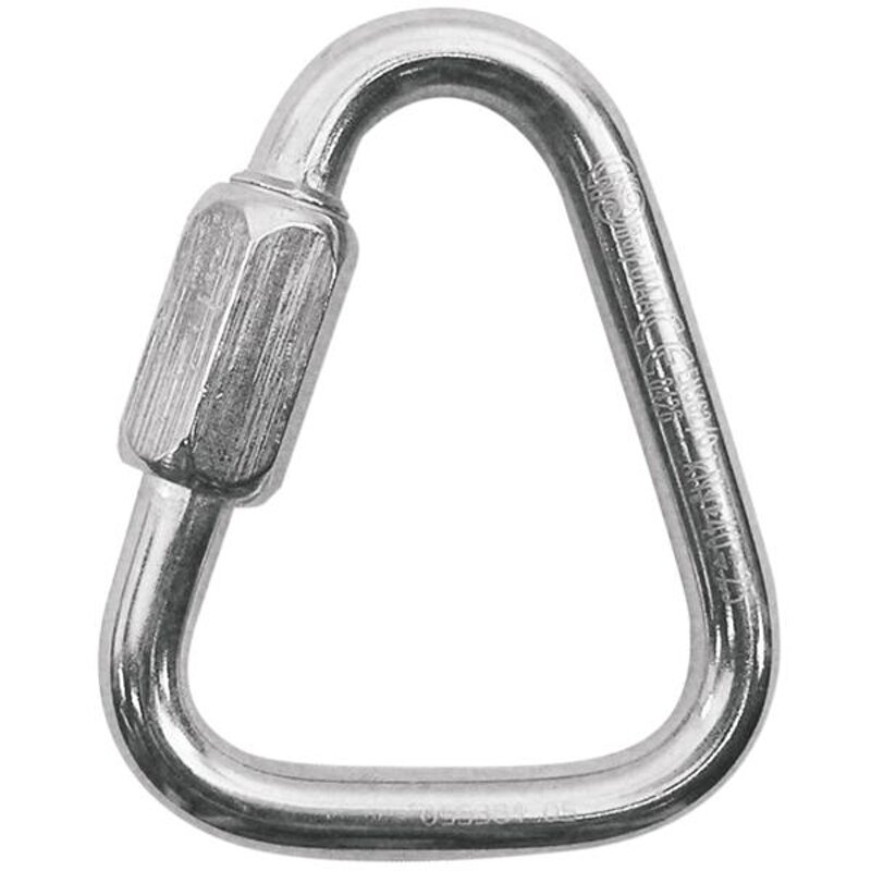 Maglia rapida triangolare in acciaio inox 316. Può essere utilizzata per collegare dispositivi ventrali all'imbrago.