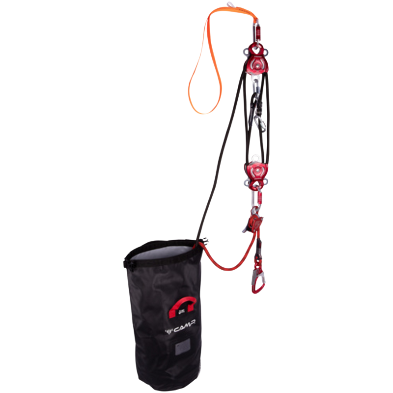 Kit da soccorso dotato di paranco ad alta efficienza per il sollevamento dell'infortunato in seguito ad una caduta, lo sgancio del sistema anticaduta e la calata fino a terra con il discensore Druid.